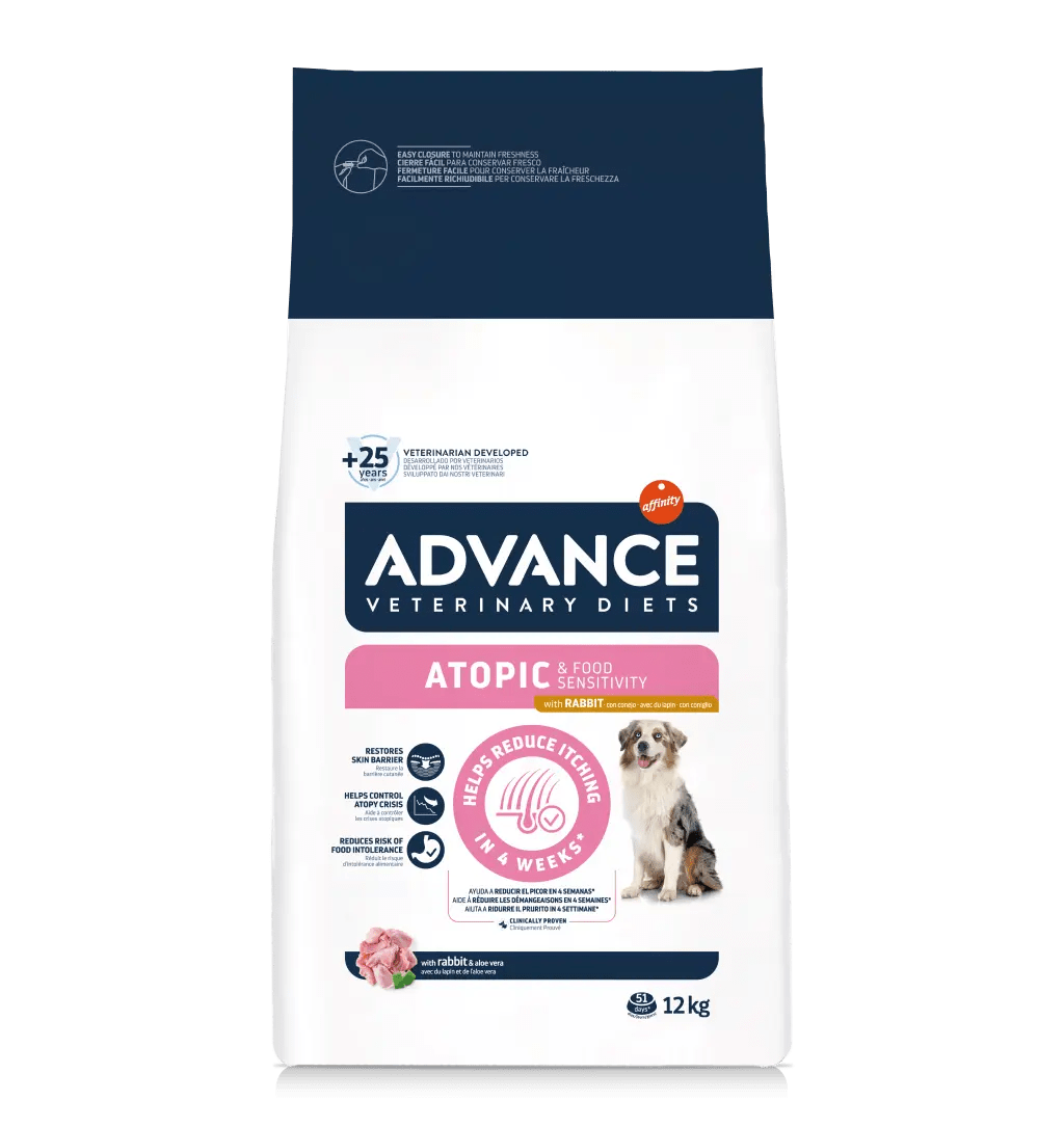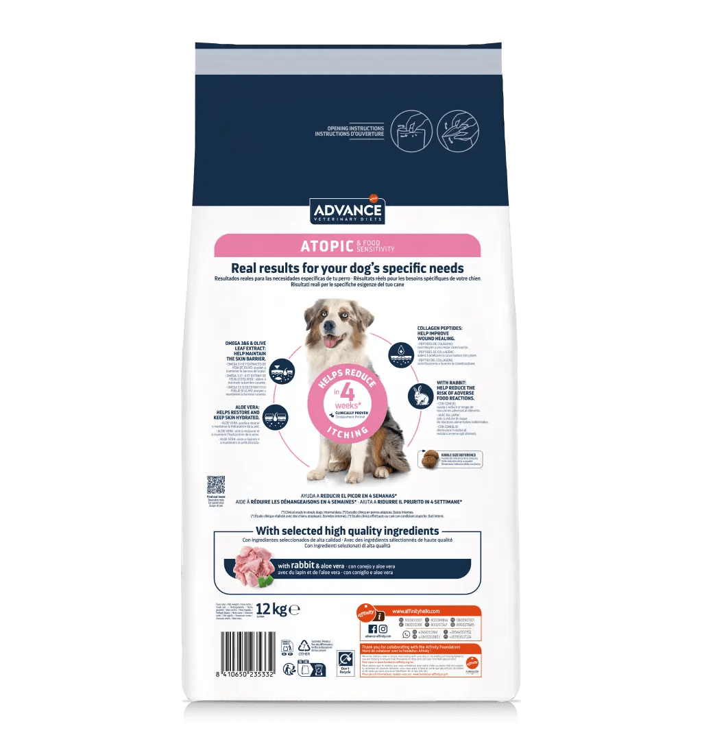 Advance Atopic cu Iepure 12kg este o hrană dietetică, formulată special pentru câinii adulți cu sensibilități cutanate, dermatite sau cădere excesivă a părului. Rețeta sa fără cereale, foloște carnea de iepure ca unică sursă de proteină animală și mazăre pentru un aport de carbohidrați și fibre ușor digerabile.