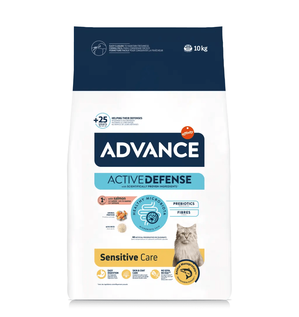 Advance Pisici Sensitive este o hrană uscată Super Premium, special formulată pentru a răspunde nevoilor nutriționale ale pisicilor adulte cu digestie delicată sau sensibilități alimentare. Cu somon drept unică sursă de proteine animale și orez ușor digerabil, această rețetă monoproteică exclude soia și ouăle, reducând riscul reacțiilor adverse și sprijinind o digestie eficientă.