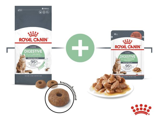 Combină măncarea granulată Royal Canin Digestive Care cu plicul umed în sos pentru a răsfăț binemeritat.