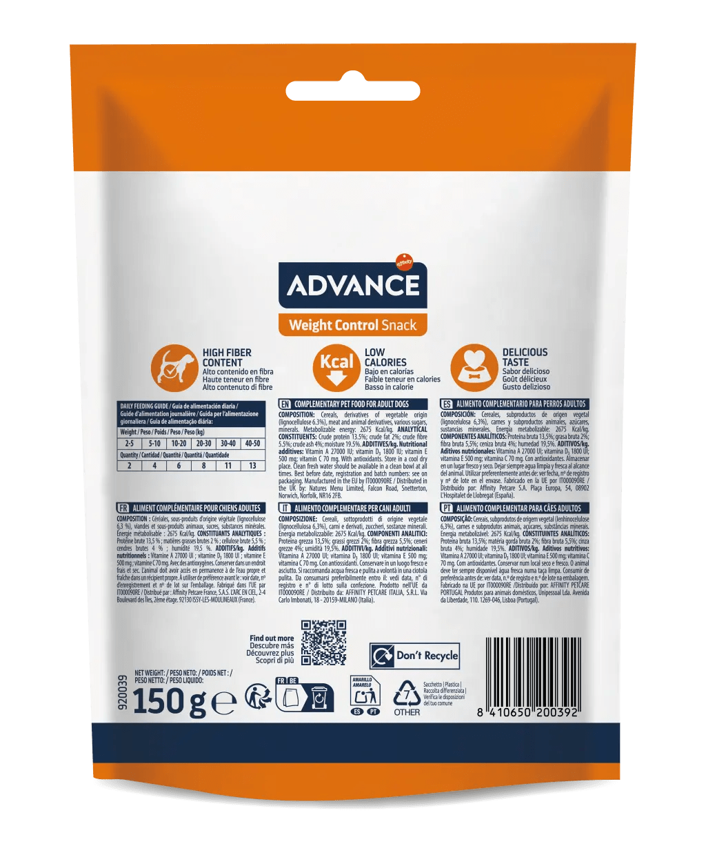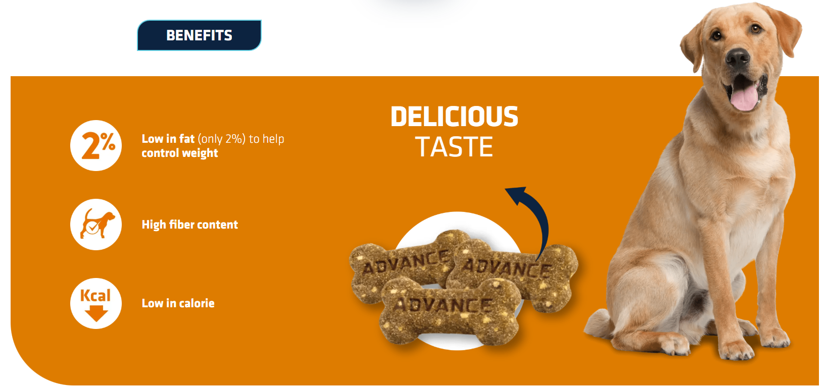 Recompensele Weight Control sunt o gustare sănătoasă cu conținut scăzut de calorii și grăsimi (2%). Bogate în fibre și cu aromă deliciosă, biscuiții Advance pentru controlul greutății permit proprietarilor să ofere un deliciu fără a compromite dieta de slăbire.